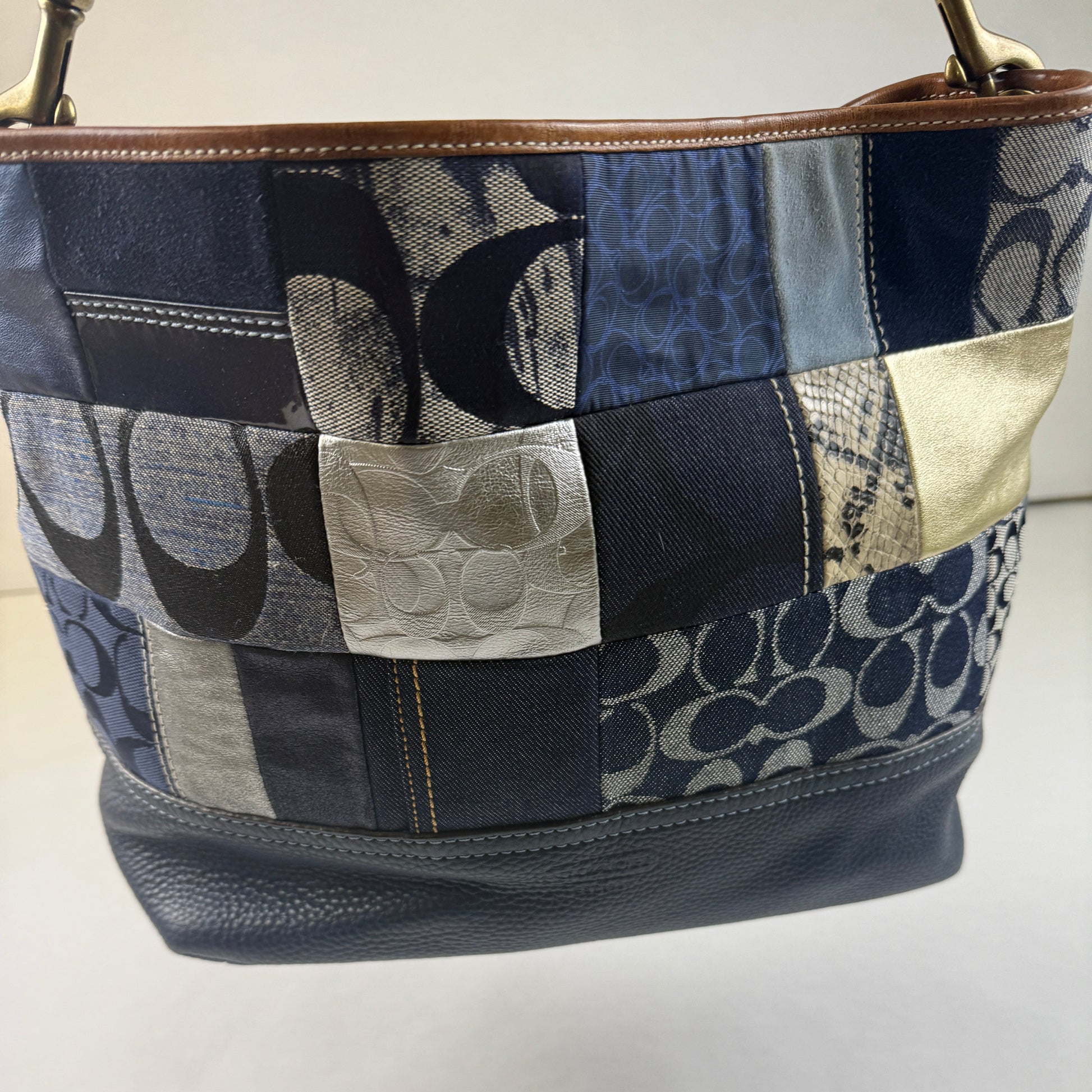 Designer Denim and Metallic Patchwork Coach Hand Bag